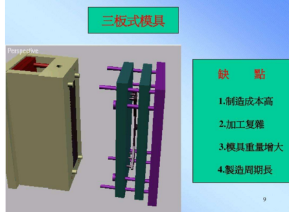 細水口模具又叫三板式模具,的流道及澆口不在分型線上,一般直接在產(chǎn)品上,所以我們在設計的時候多一組水口分模線,設計較為復雜,加工較困難,一般要視產(chǎn)品和客戶要求而選用細水口系統(tǒng)。這種模具的澆口位置選擇的地方比較多,而且開模時流道澆口與產(chǎn)品會自動分開,也省去了剪澆口這一步驟,被稱呼為三板式模具