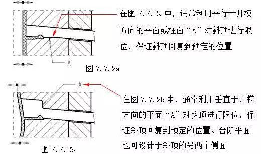 在斜頂機(jī)構(gòu)中,為了保證斜頂工作穩(wěn)定、可靠,應(yīng)該注意以下幾點(diǎn):(A)斜頂?shù)膭傂?。增?qiáng)斜頂剛性一般采用:1.在結(jié)構(gòu)允許的情況下,盡量加大斜頂橫斷面尺寸。(參見(jiàn)第七章7.2節(jié))2.在可以滿(mǎn)足側(cè)向出模的情況下,斜頂?shù)男倍冉恰癆”盡量選用較小角度,斜角A一般不大于20°,并且將斜頂?shù)膫?cè)向受力點(diǎn)下移,如增加圖7.7.1a中的鑲塊2,同時(shí)鑲塊可以具有較高的硬度,提高 模具 的壽命。(B)斜頂橫向移動(dòng)空間。如圖7.7.1a所示尺寸“D”,為了保證斜頂在頂出時(shí)不與膠件上的其它結(jié)構(gòu)發(fā)生干涉,應(yīng)充分考慮斜頂?shù)膫?cè)向分模距離、斜頂?shù)男倍冉恰癆”,以保證有足夠的橫向移動(dòng)空間“D”。(C)斜頂在開(kāi)模方向的復(fù)位。為了保證合模后,斜頂回復(fù)到預(yù)定的位置,一般采用下面的結(jié)構(gòu)形式。如圖7.7.2a;7.7.2b。